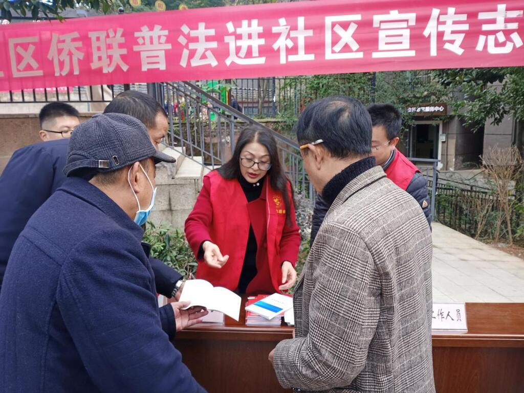 黔江区侨联组织部分侨联委员、代表和律师志愿者在城南街道三台山社区开展普法进社区宣传活动。当地社区居民提供法律咨询服务,并发放《中华人民共和国归侨侨眷权益保护法》、侨法宣传单等资料200余份。